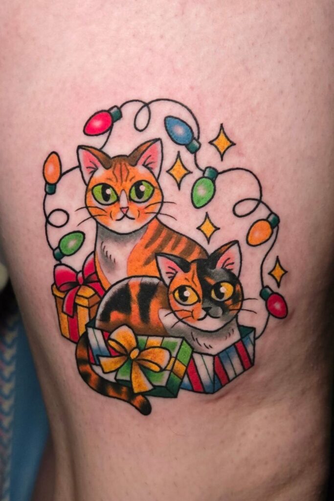 These designs, often seen in Christmas inspired tattoos, symbolize joy, celebration, and that warm holiday glow.