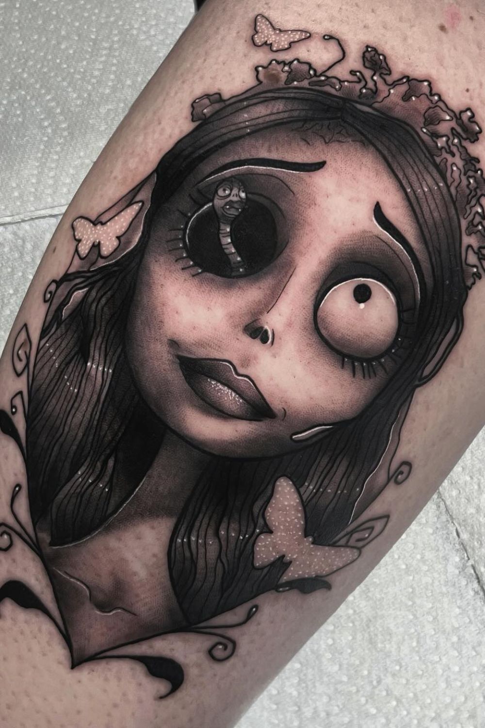 For those who want to go big, a corpse bride tattoo design as a full sleeve is stunning.