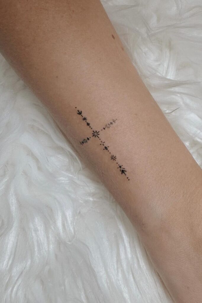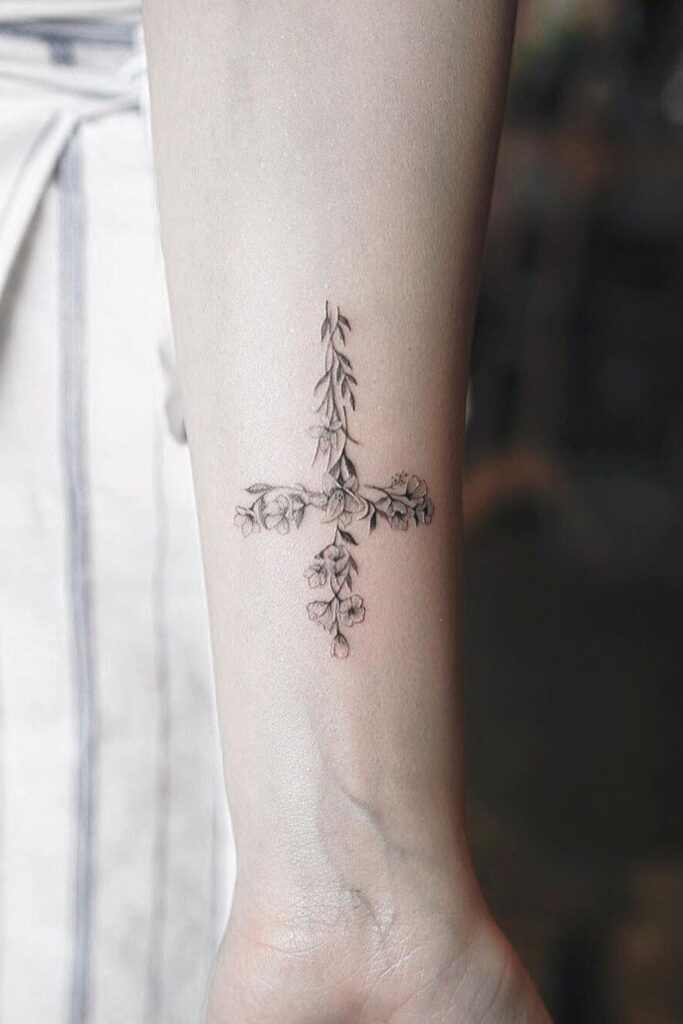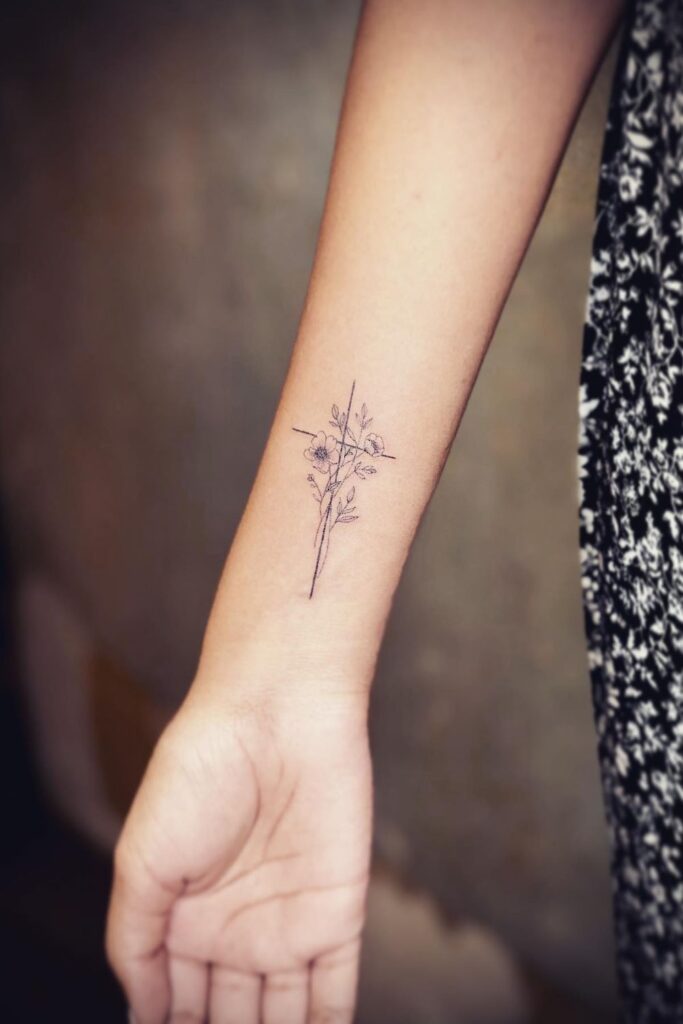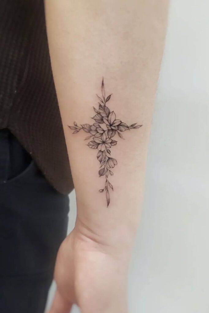One of the most feminine and creative takes on cross tattoos for women is blending them with floral designs.