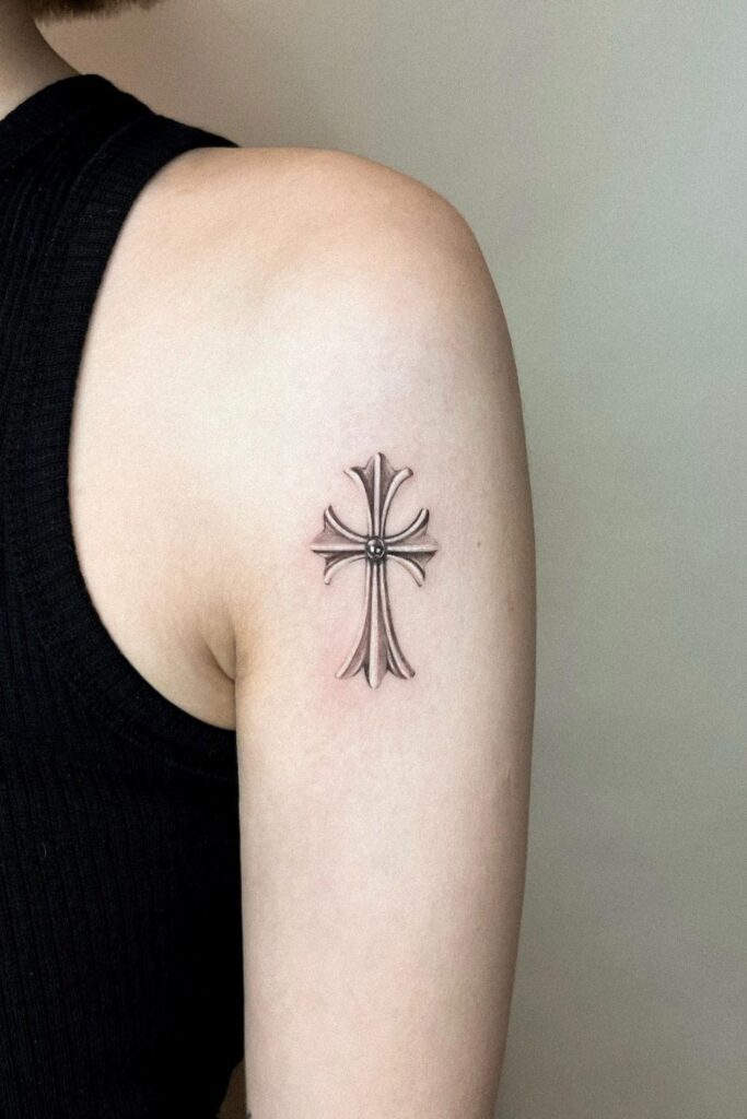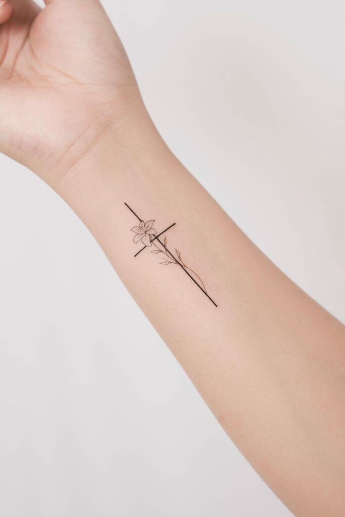 These tattoos cross for women can also be enhanced with fine-line detailing, mini flowers, or light shading.