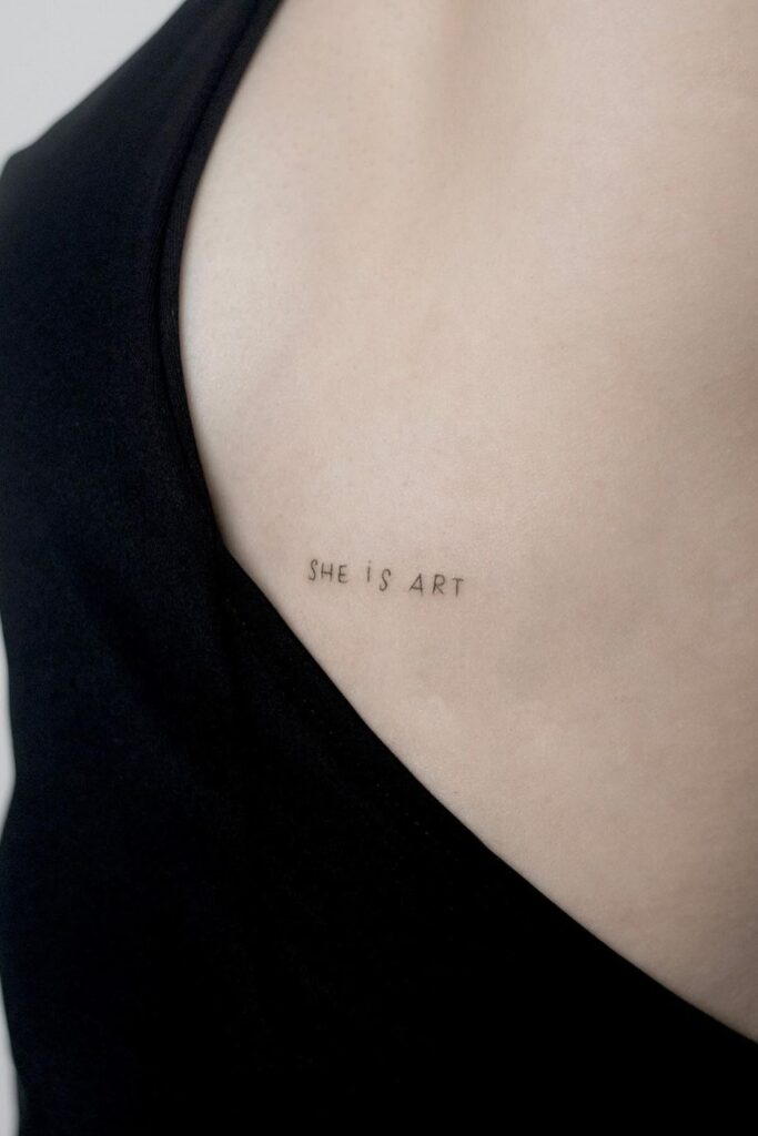 “She is art” by nhi.ink is inked in fine, spaced lettering along the ribcage, turning the wearer’s body into a living canvas.