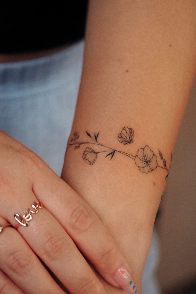 Wrapping around the wrist, this floral band by bunami.ink is a celebration of nature and femininity, complete with a gentle butterfly hovering above.