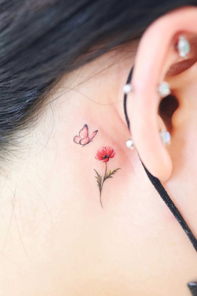 This tiny butterfly and red poppy bloom by vane.tattoo_ rest just behind the ear, giving off an ethereal and feminine vibe.