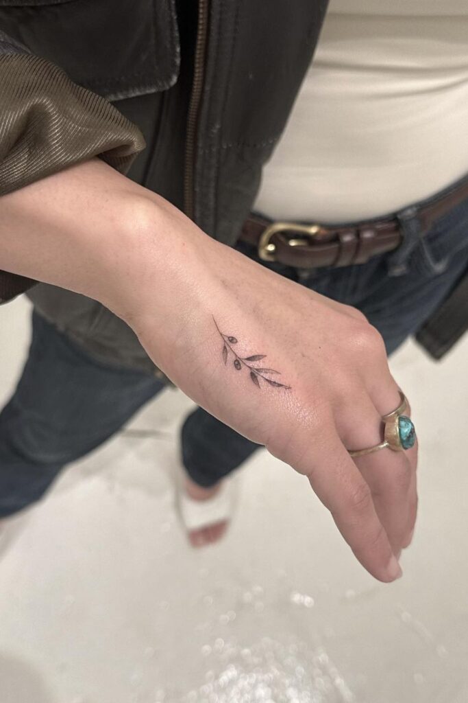 The olive branch often symbolizes peace, resilience, and personal growth. Placed where it gently follows the hand’s natural curve, this tattoo feels personal and poetic.