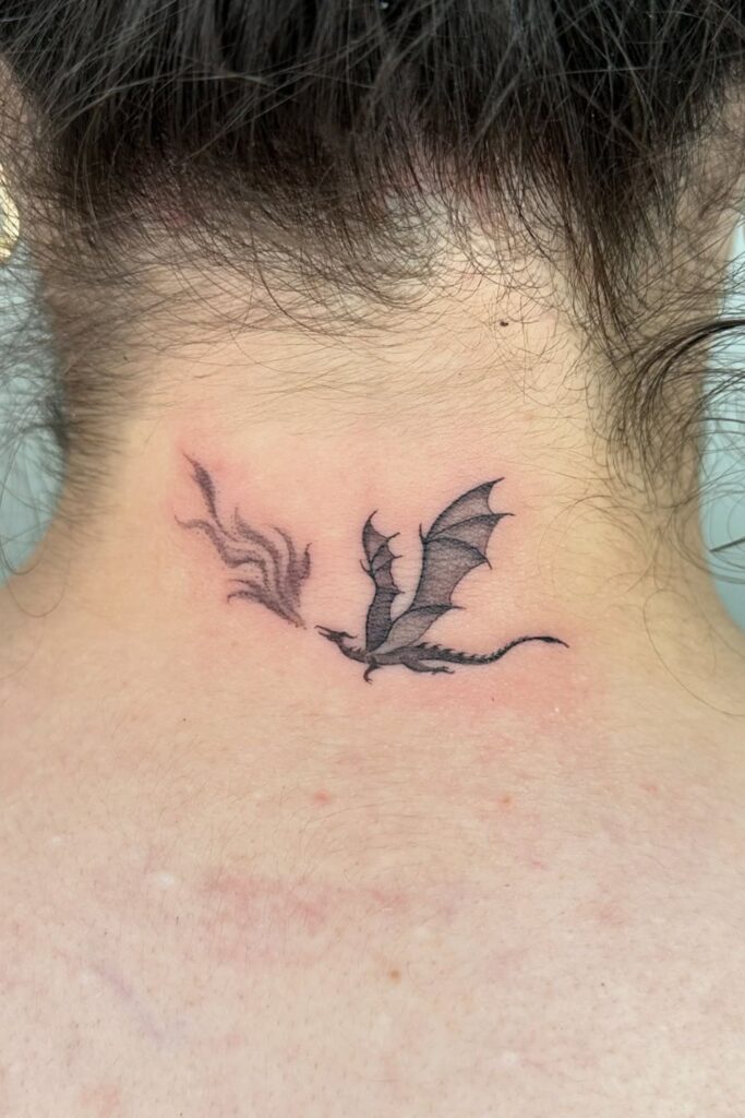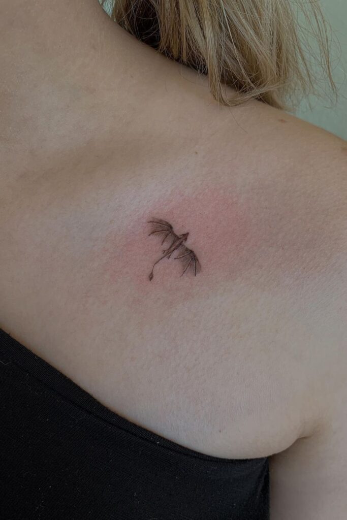 A small dragon by bohemycollective soars across the collarbone in a fine-lined silhouette, giving a hint of fantasy and fire.