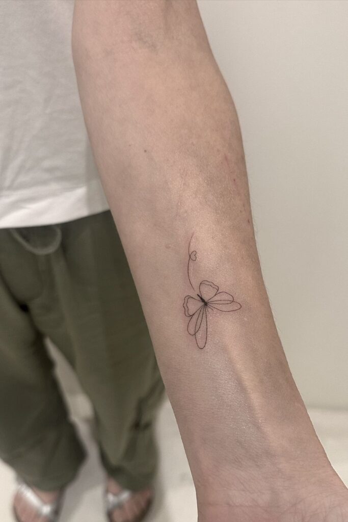 This is the kind of dainty feminine tattoo that feels light, dreamy, and perfect for someone embracing love, freedom, and transformation.