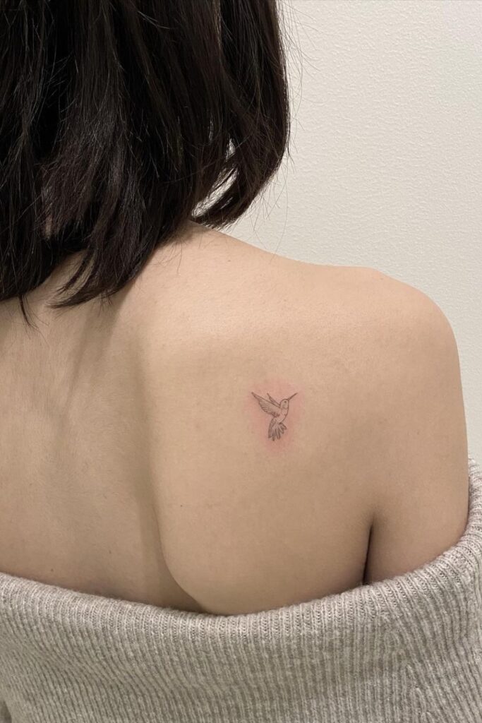 Tiny Hummingbird Tattoo on Shoulder Blade