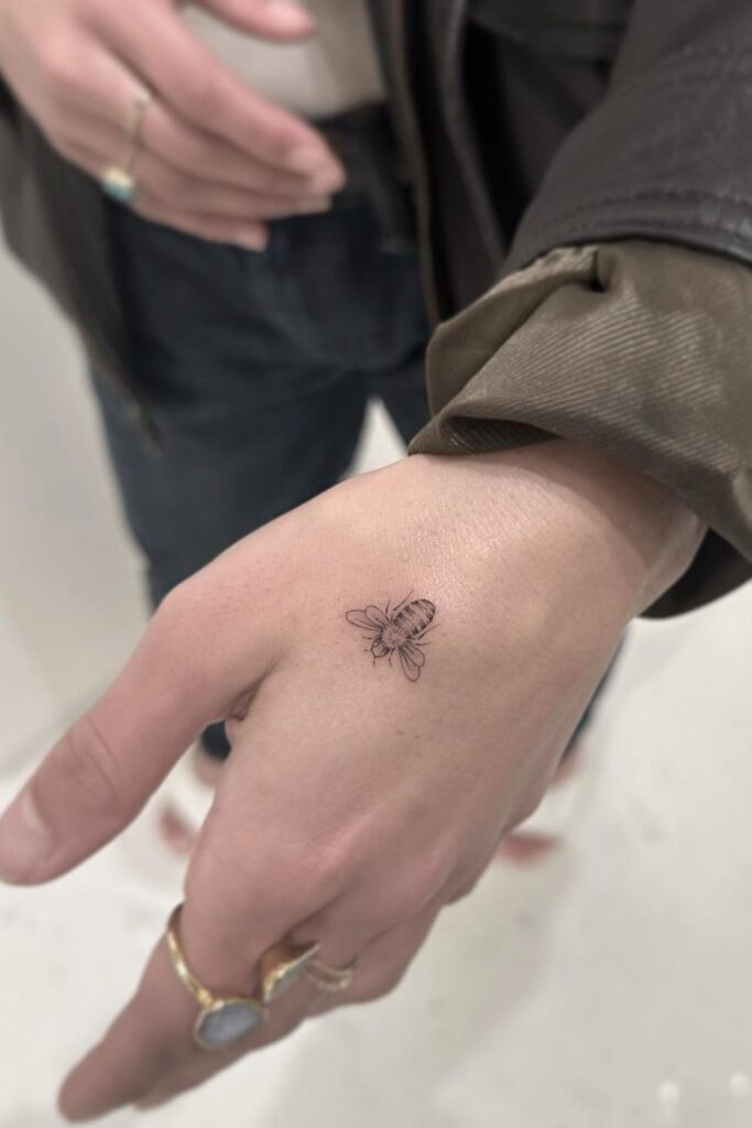 Buzzing with symbolism, this tiny bee tattoo by liqfromthewood is all about community, hard work, and sweetness in life.