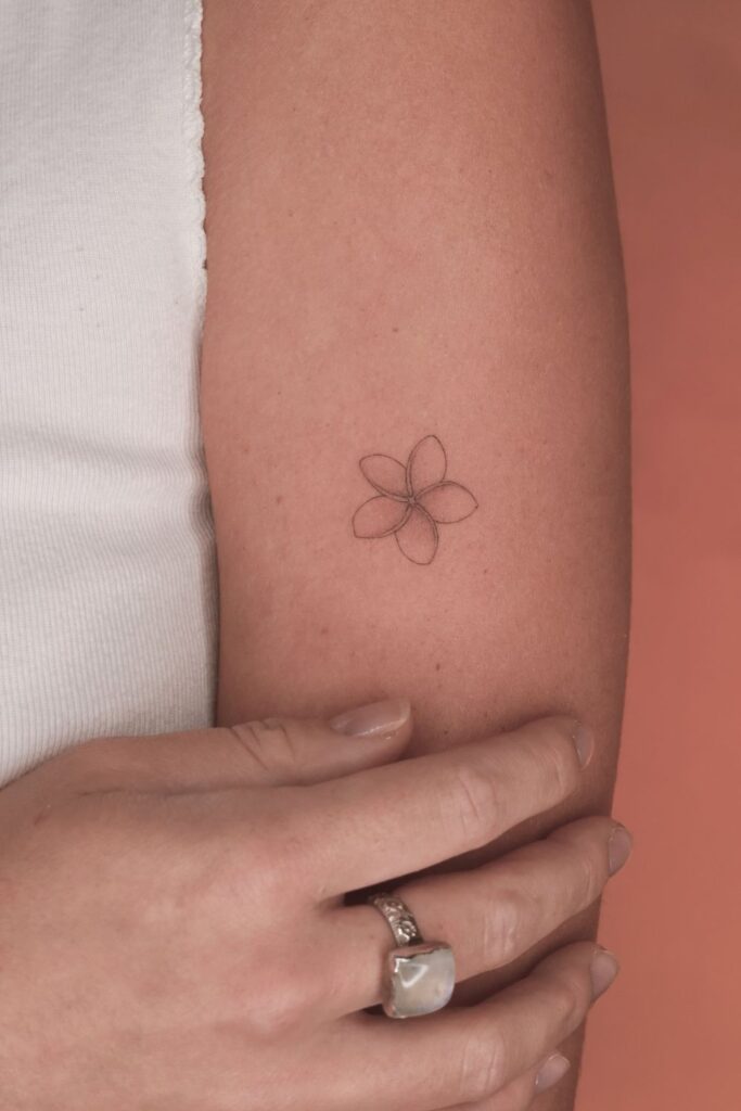 Placed on the outer upper arm, this fine-line flower tattoo by wil.tats features an overlapping petal design that radiates symmetry and peace.