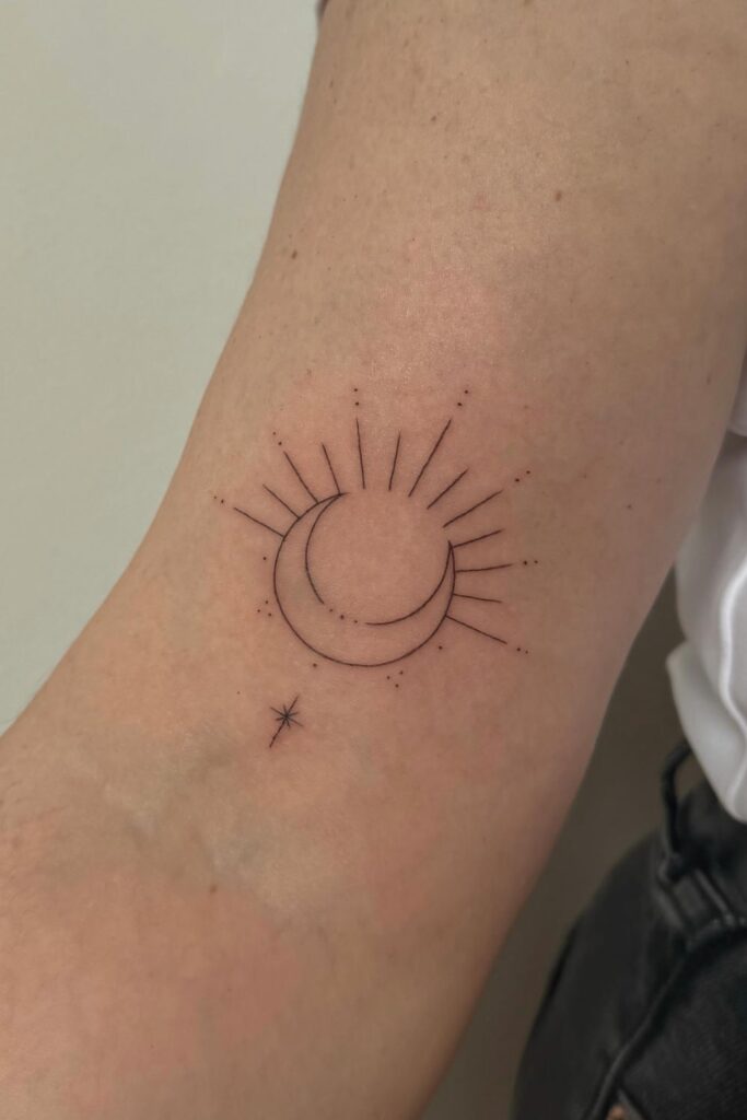 This fine-line crescent moon surrounded by subtle sunrays by oatmilktattoo is both magical and balanced.