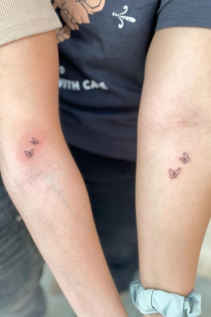 These tiny matching butterfly tattoos by vibetattoo.ut sit delicately on the elbow crease, a playful and symbolic spot.