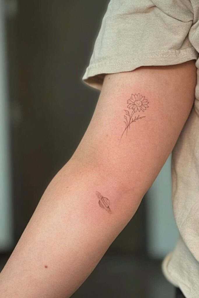 A daisy and a delicate Saturn planet are tattooed separately but harmoniously on the arm by inkme.babyy, one near the tricep and the other just below the elbow.