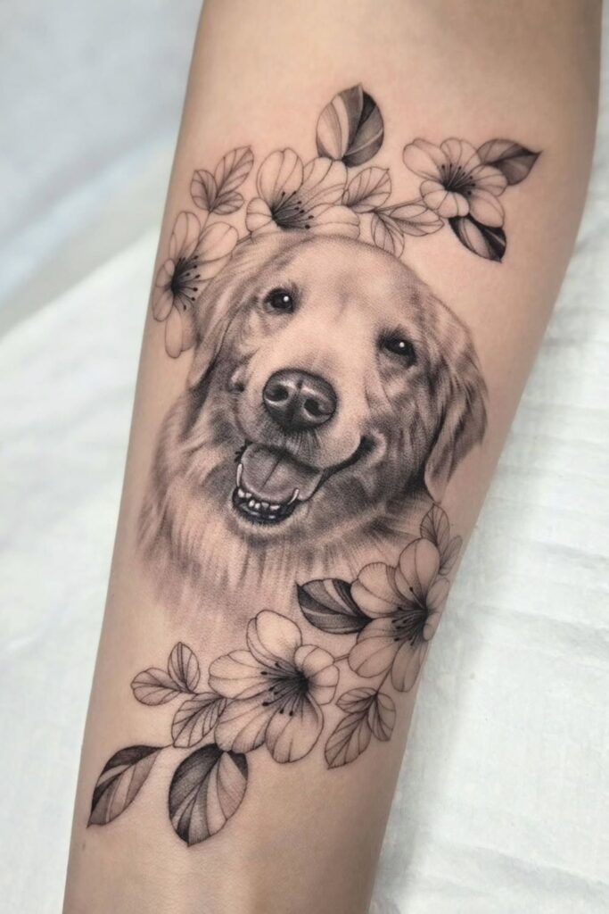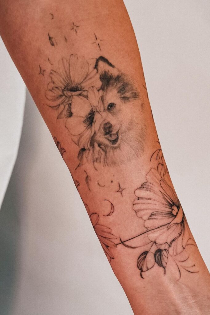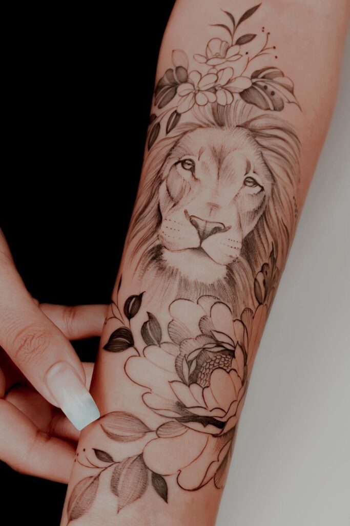 From dog portraits surrounded by roses to lions surrounded by lilies, these tattoos often represent strength, beauty, and balance.