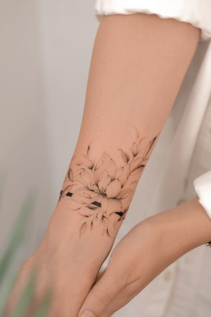 A delicate black-ink flower wrapping around the wrist creates a soft, graceful look.