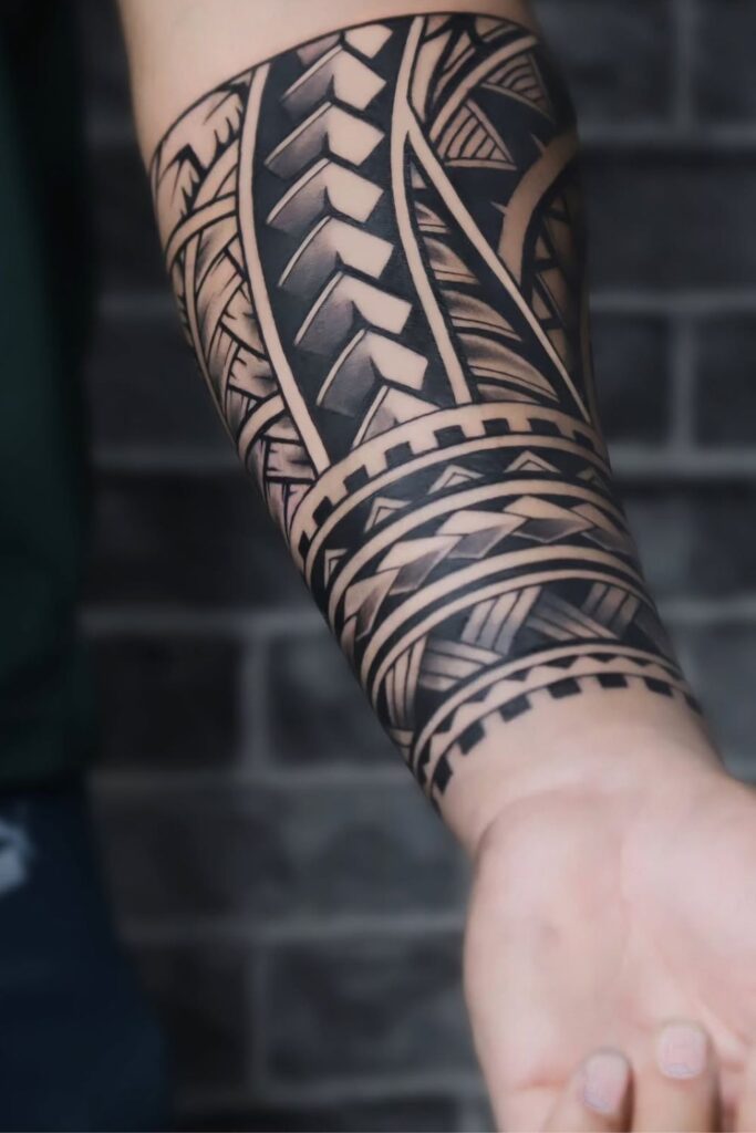 This forearm half sleeve combines traditional shapes, rhythmic patterns, and rich blackwork to create a meaningful polynesian-inspired design.