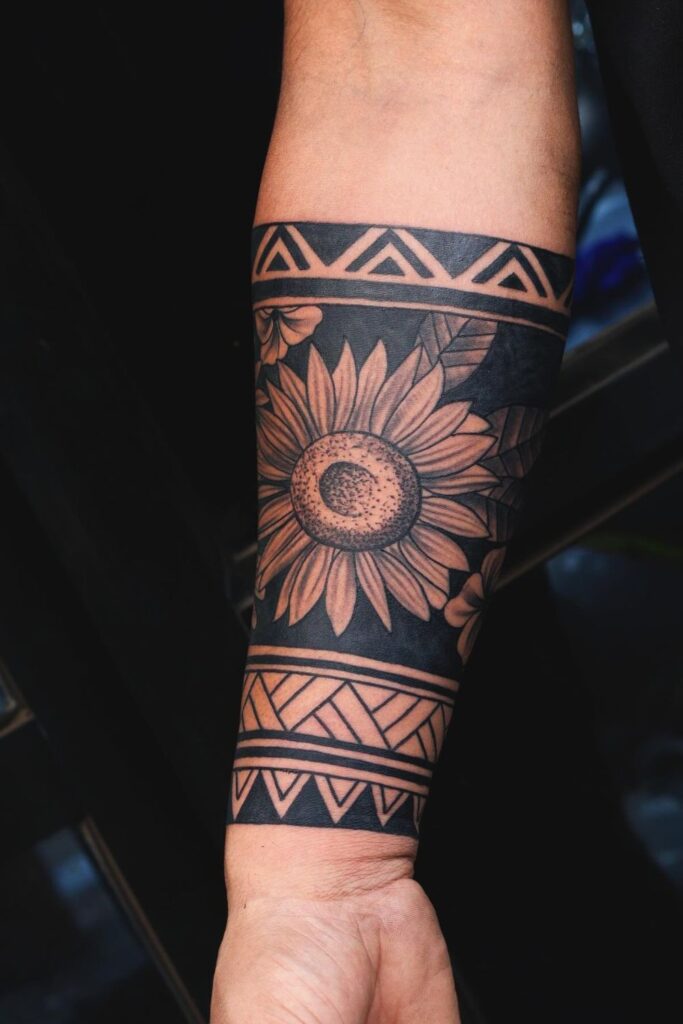 This unique forearm sleeve blends a detailed sunflower with bold tribal patterns, creating a balance of softness and strength.