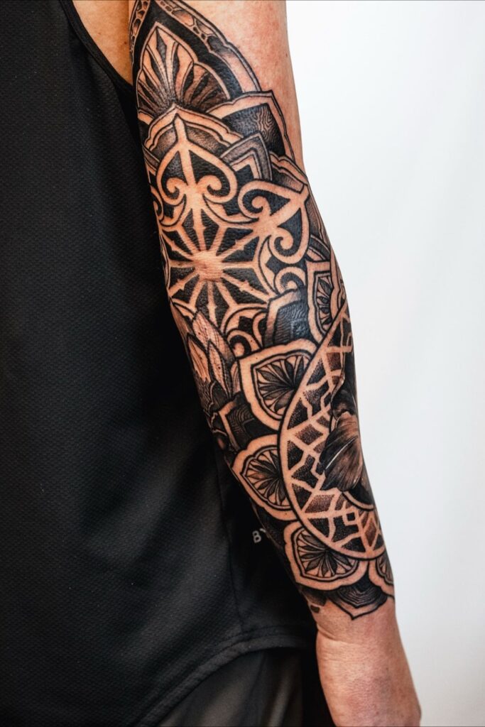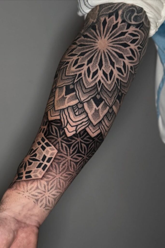 This forearm tattoo combines thick black shapes with mandala details to create a bold, dramatic sleeve.