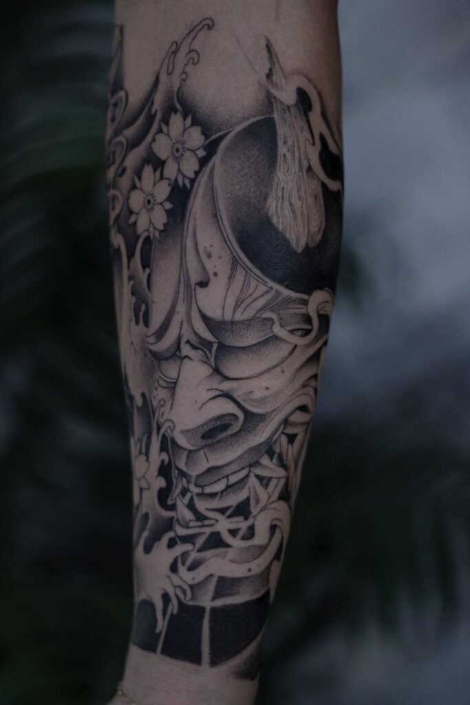 Japanese-Inspired Mask and Floral Forearm Sleeve