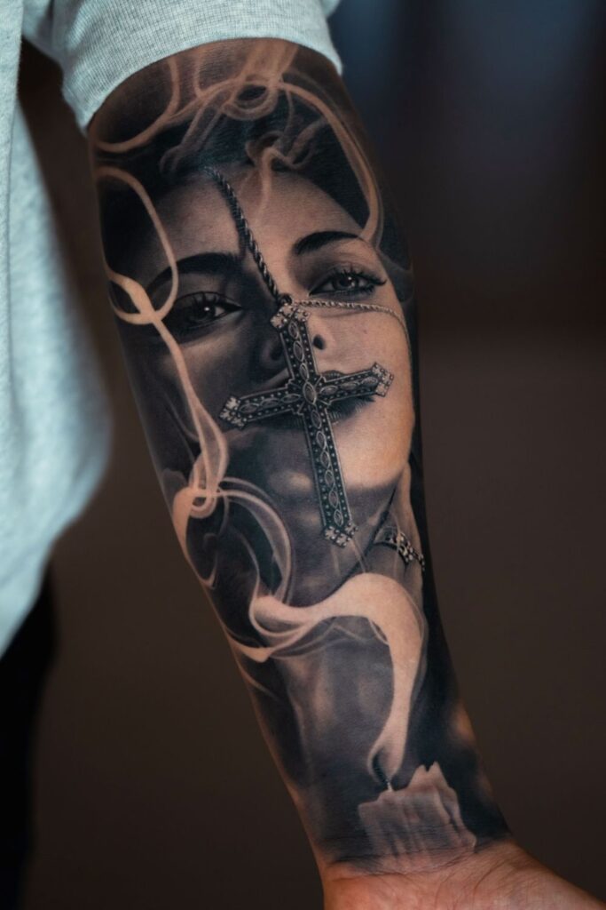 This detailed forearm sleeve features a soft, emotive portrait paired with a textured cross and flowing smoke, creating a moody and atmospheric feel.