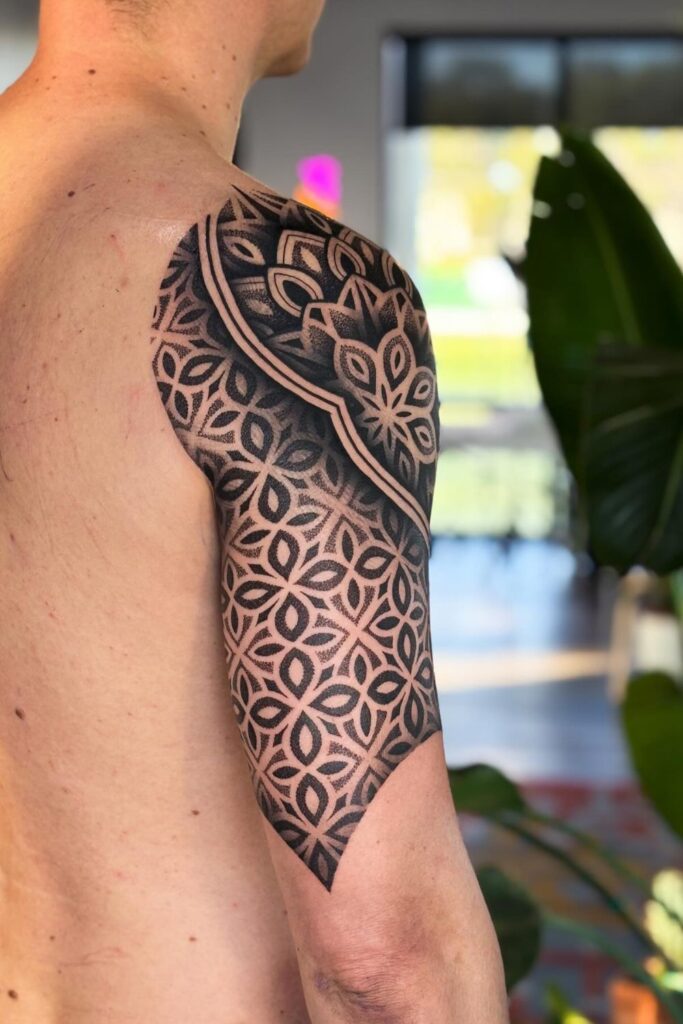 This upper arm design uses mandala-style patterns and clean dotwork to create a structured yet fluid half sleeve.