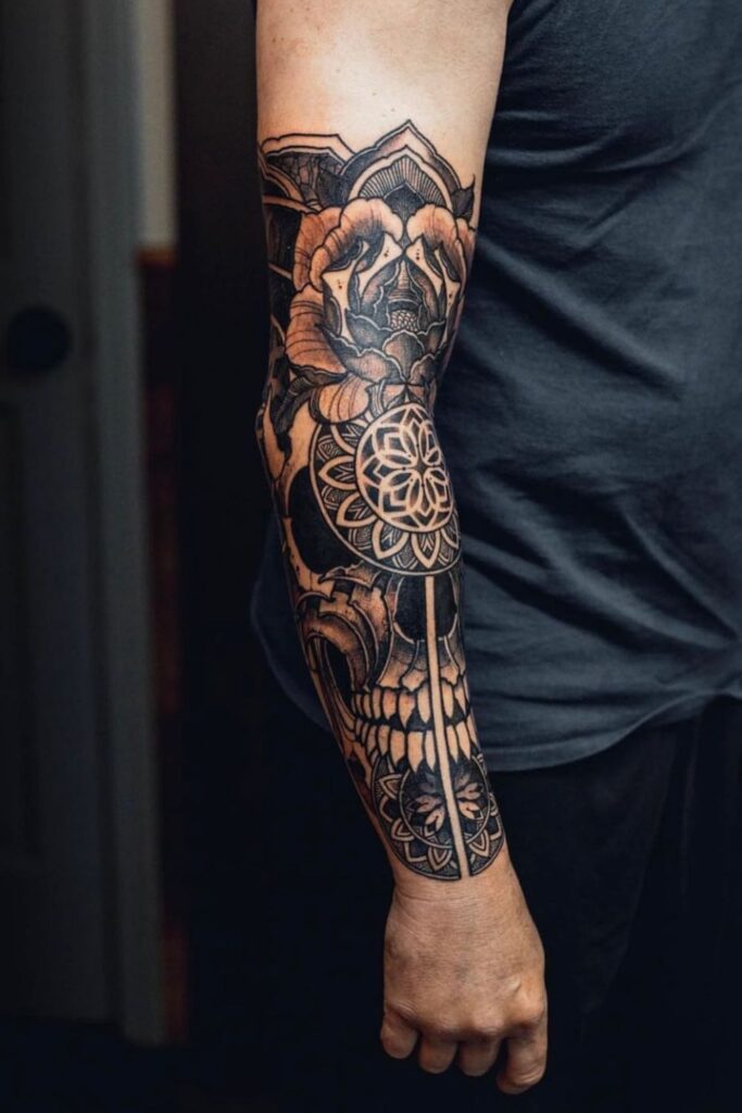 This forearm sleeve blends flowers, skull elements, and ornamental patterns into a unified dark design full of texture and depth.