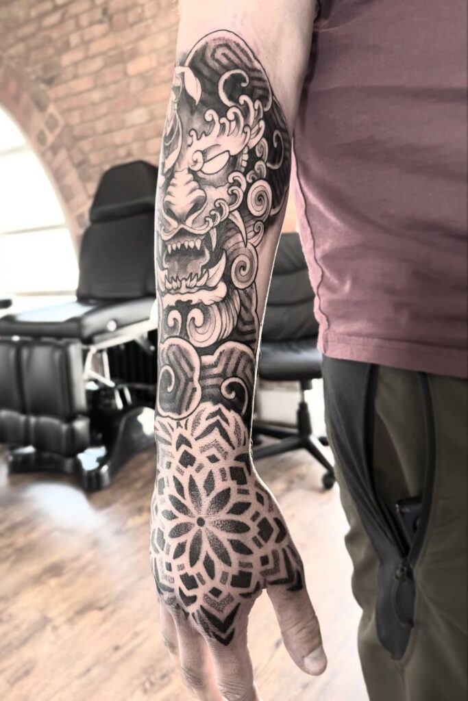 This forearm half sleeve merges a fierce mask design with patterned mandala details on the hand, creating a dynamic blend of power and symmetry.