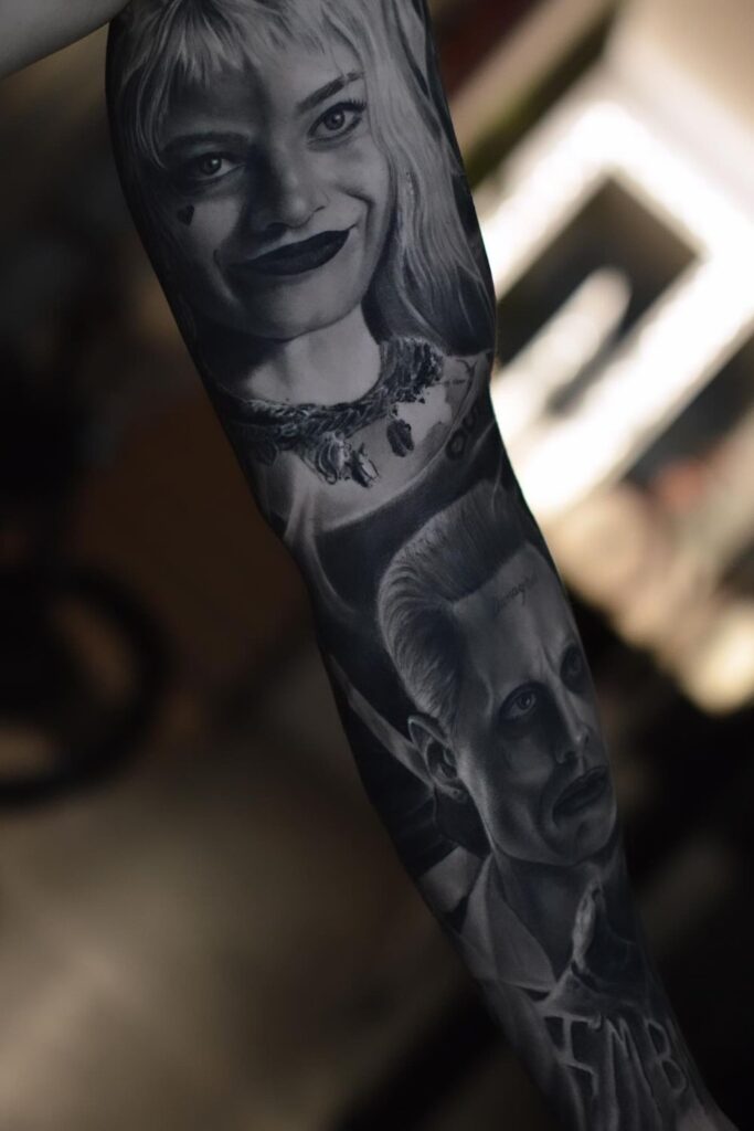 These tattoos work beautifully for fans who want Harley as a vivid portrait, almost like a snapshot from the movies or comics.