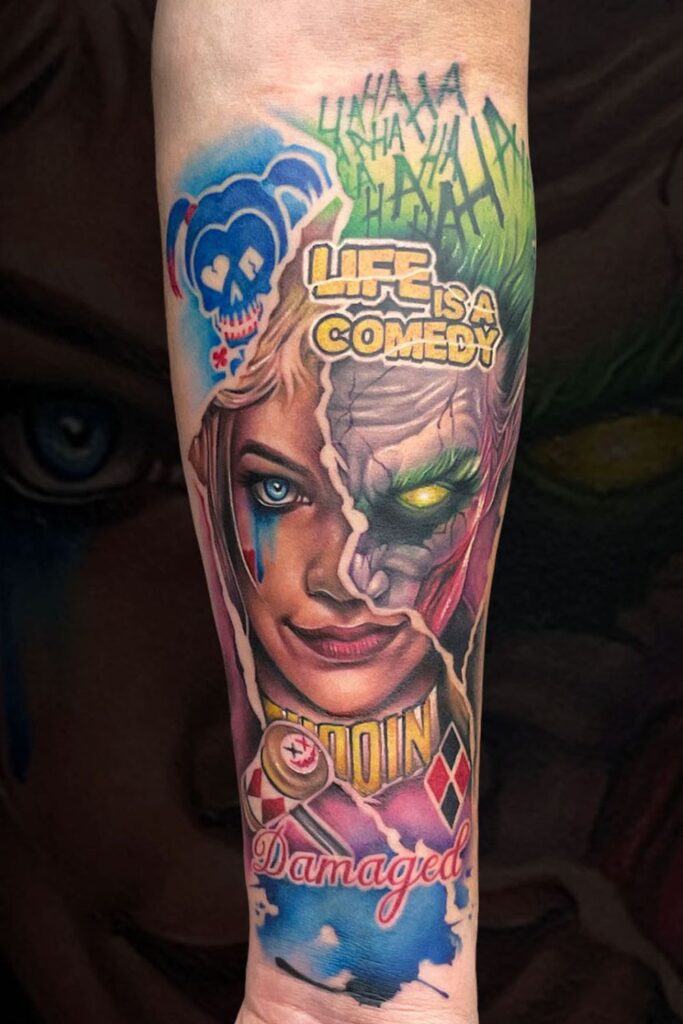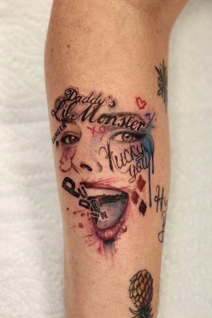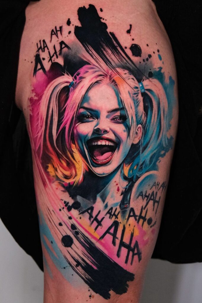 Unique Harley Quinn tattoos go beyond the traditional portraits, blending abstract, artistic, and colorful elements to create something one-of-a-kind.