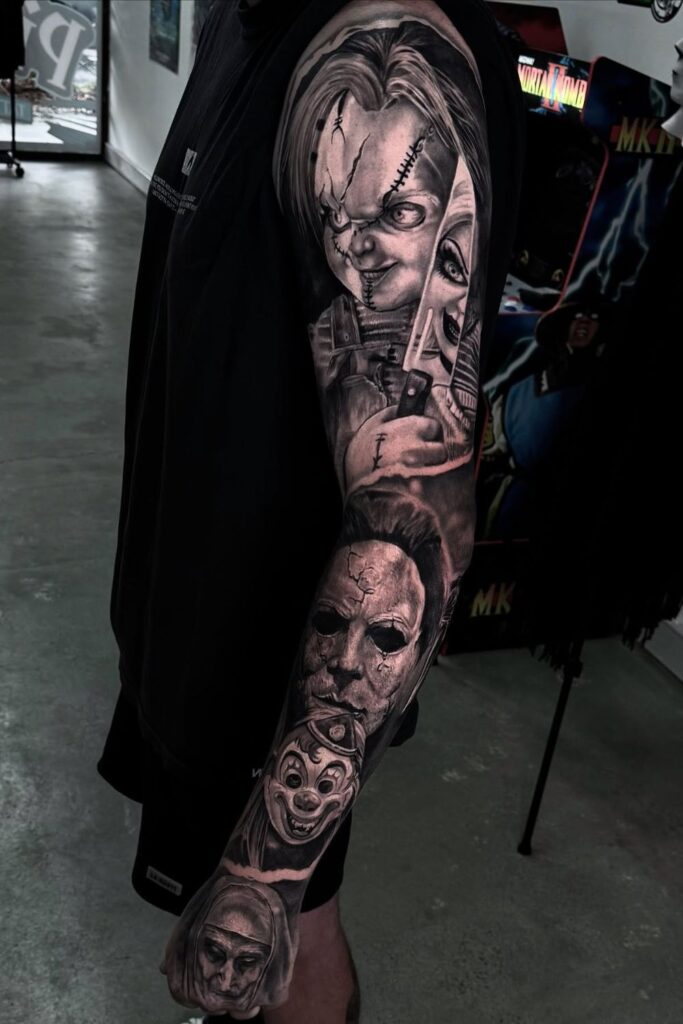 This incredible full sleeve brings together Chucky, Tiffany, Michael Myers, Annabelle, and Valak in one seamless horror collage.