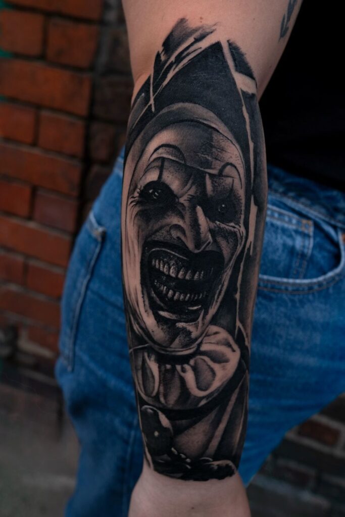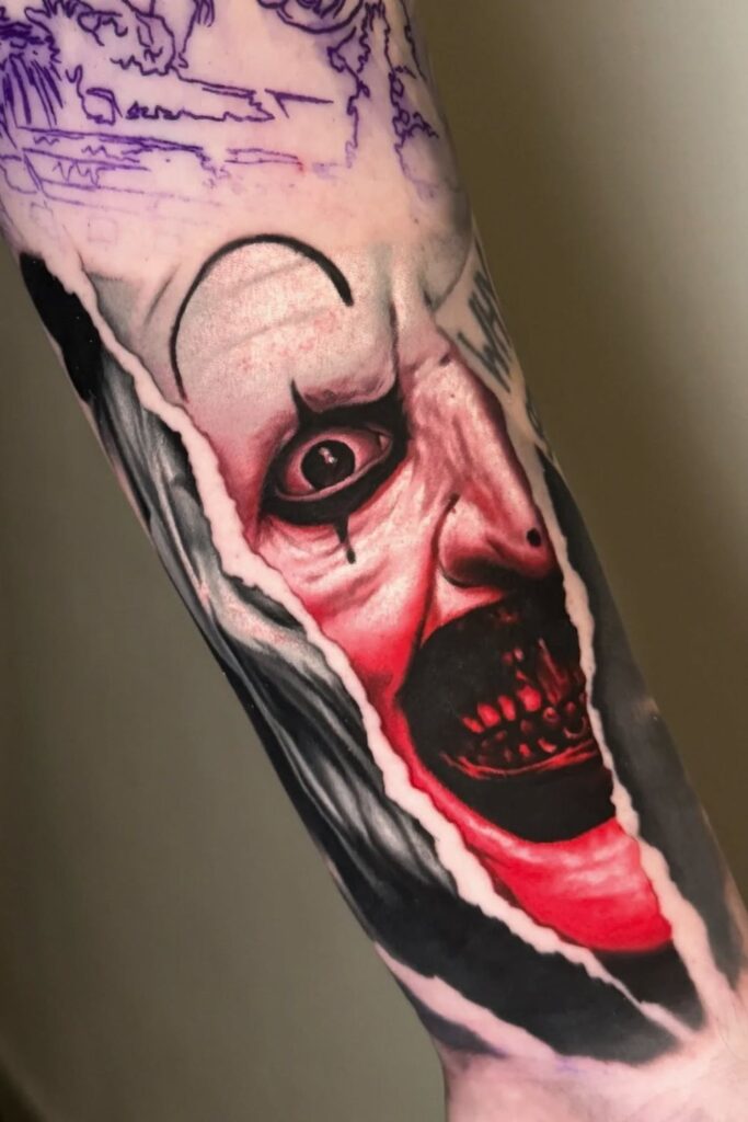 Art the Clown’s demented grin comes to life in this ultra-detailed forearm tattoo.