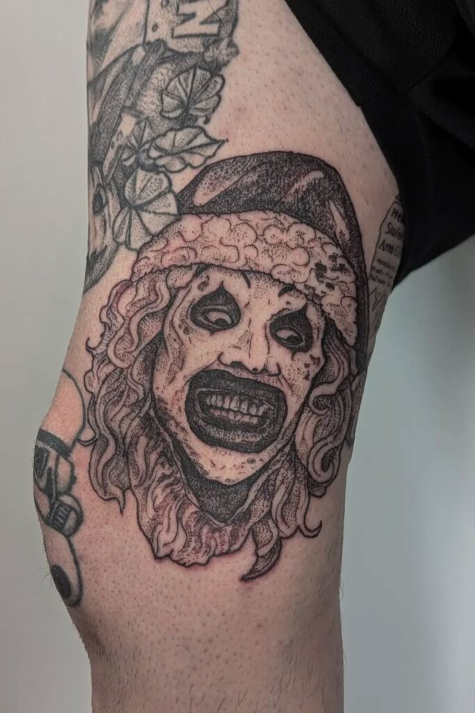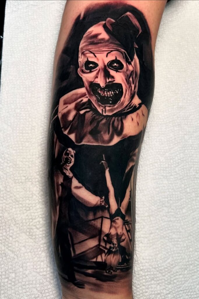 This haunting tattoo showcases Art the Clown from Terrifier, staring with his twisted, silent grin.