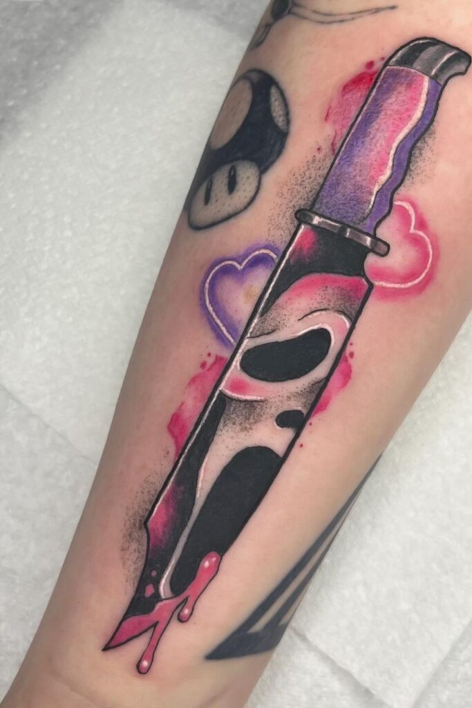 This pastel scream ghostface knife tattoo is where spooky meets sweet.