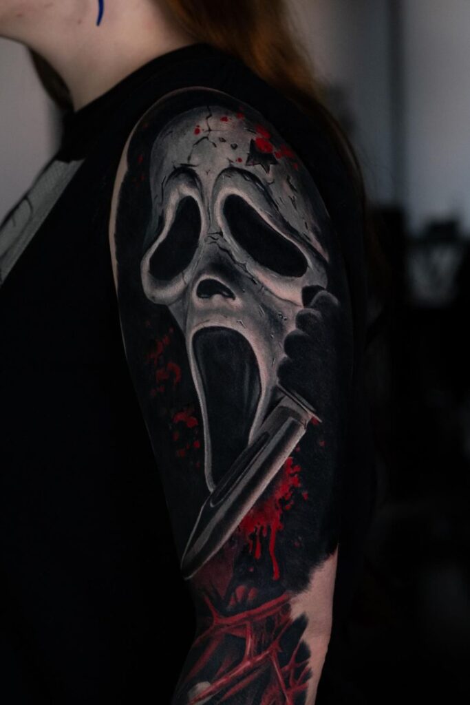 This stunning scary movie tattoos sleeve captures the raw fear of Scream with a large, cracked Ghostface mask dripping in red ink and shadowy detail.