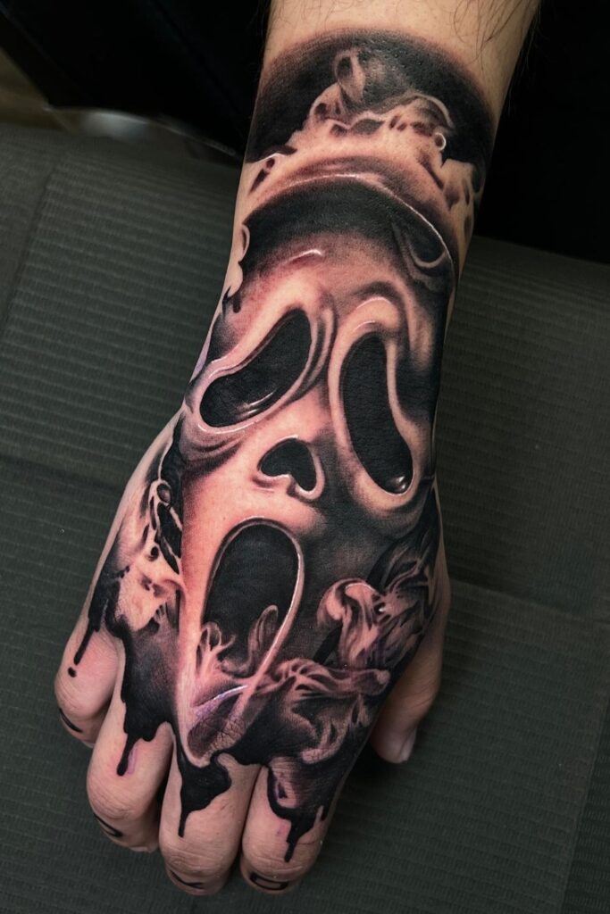A haunting take on a cult favorite, this horror characters tattoo shows Ghostface emerging from swirling smoke, perfectly wrapped around the back of the hand.