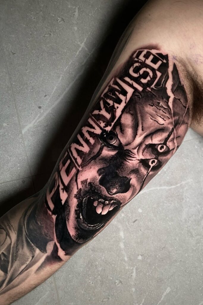 The bold lettering of “PENNYWISE” adds a punch of power to the upper bicep.