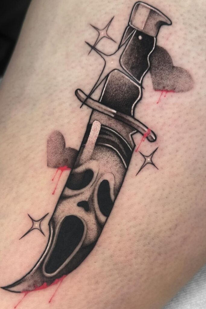 This charming yet creepy scream ghostface knife tattoo turns horror into pop art.