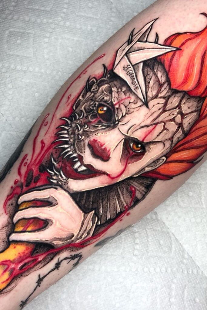 This intense horror movie tattoo brings Pennywise to life in terrifying realism.