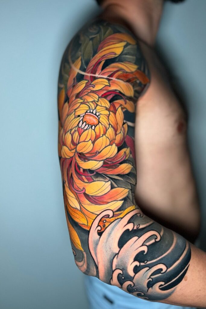 This full-arm tattoo showcases a magnificent golden chrysanthemum surrounded by dynamic waves.