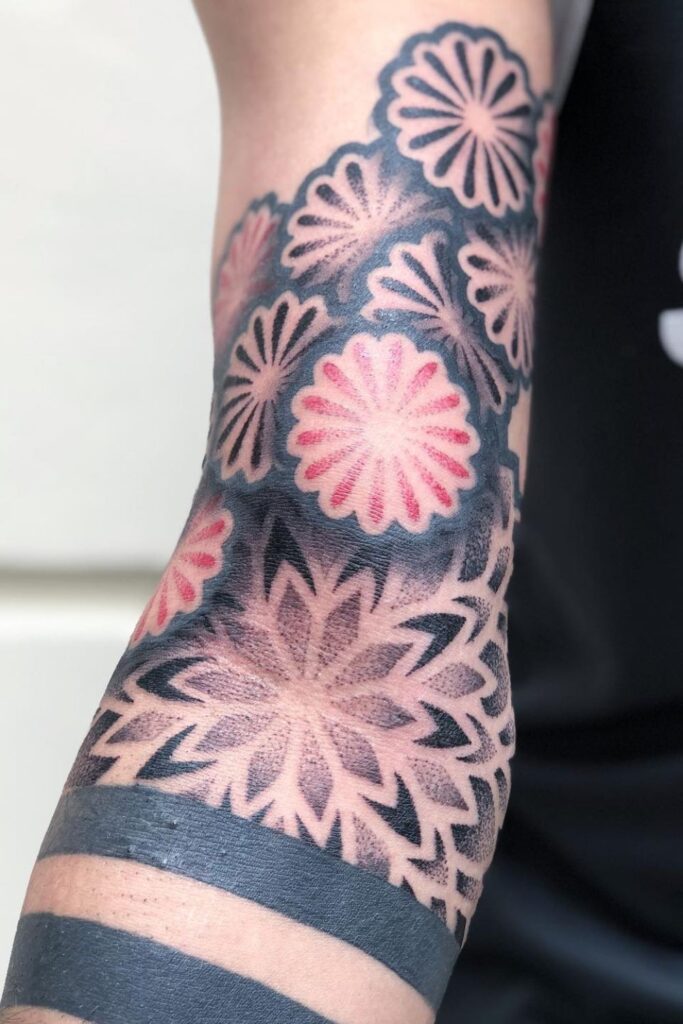 This abstract floral sleeve features soft pink flowers with dark negative space, creating a bold and modern interpretation of Japanese floral motifs.