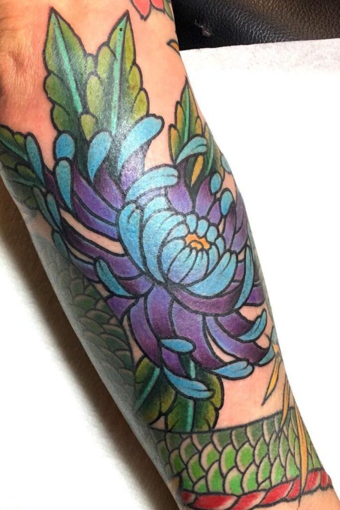 A dynamic chrysanthemum tattoo with deep purple and blue hues.
