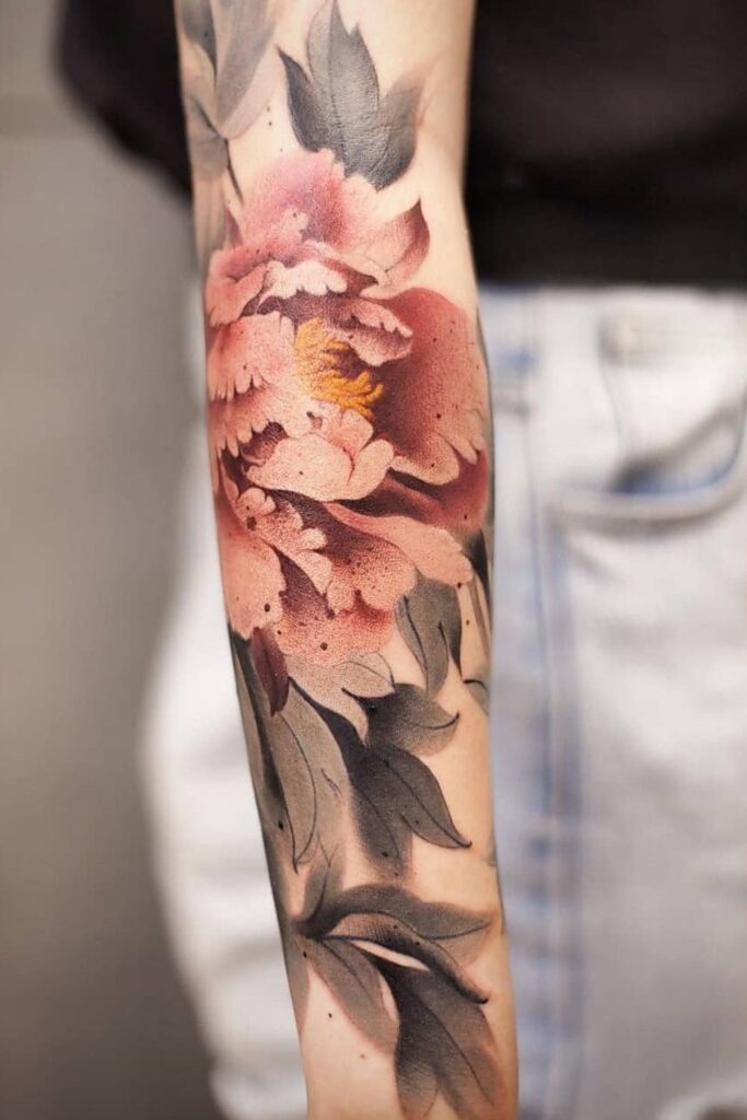 This forearm tattoo features a soft, smoky rendition of a peony with muted pink petals and dark leaves.