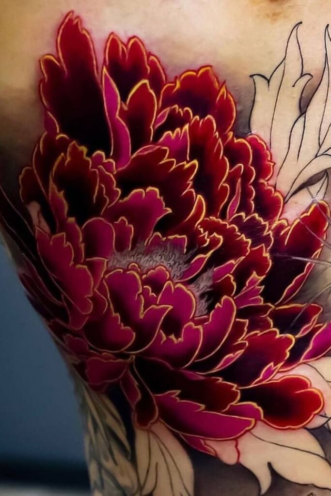 This striking peony tattoo showcases rich red petals outlined with golden details, giving it a dramatic and luxurious appearance.