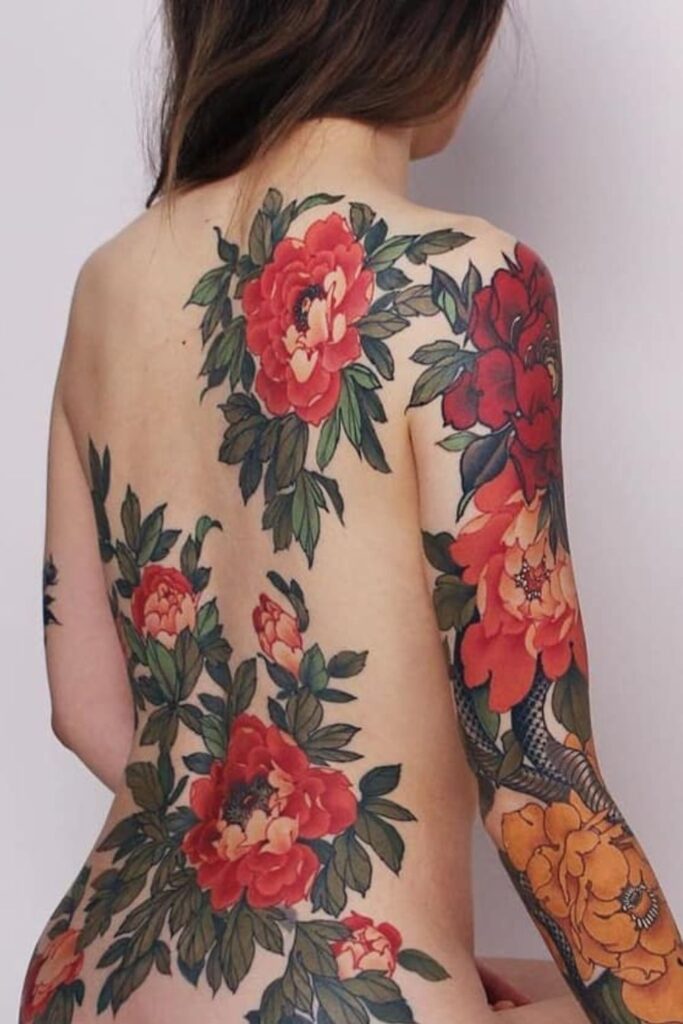 A stunning full-back design combining vibrant red and orange peonies with intricate green leaves and a detailed snake.