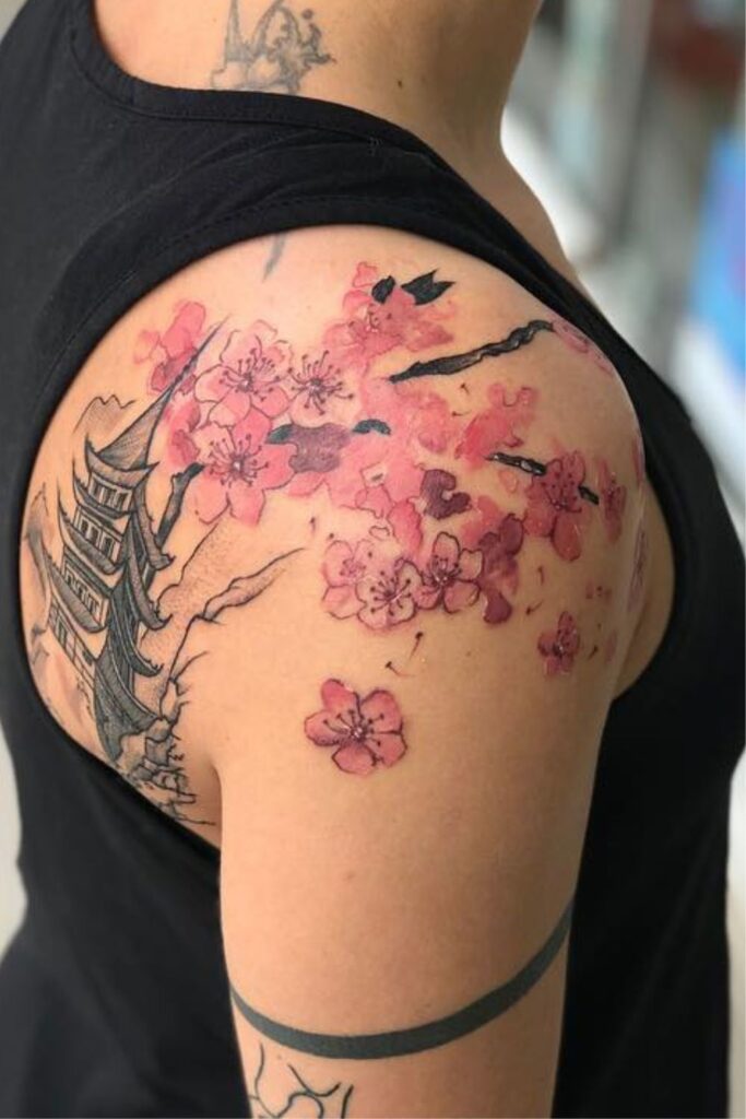 This shoulder tattoo showcases delicate cherry blossoms in soft pink hues paired with a black-and-grey pagoda.