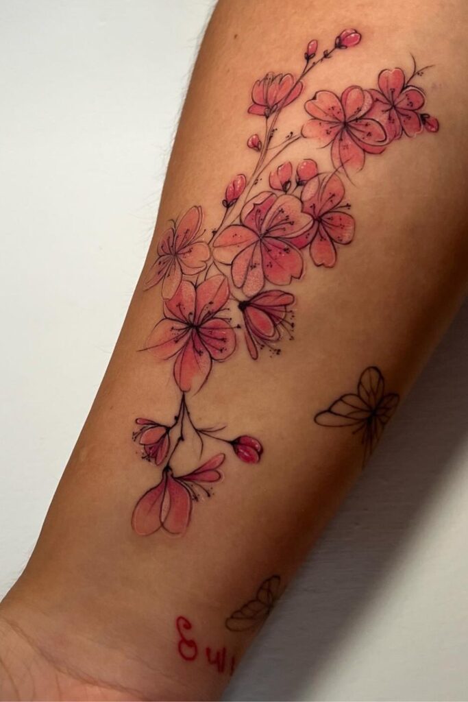 A stunning depiction of cherry blossoms cascading down the arm, this tattoo highlights the transient beauty of life.