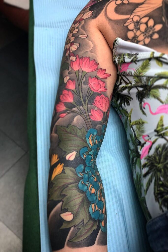 A mesmerizing full sleeve featuring vibrant red, yellow, and green flowers set against a dark background.