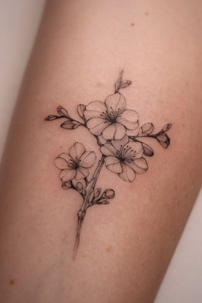 This black and grey cherry blossom tattoo emphasizes fine lines and shading to create a sophisticated look.