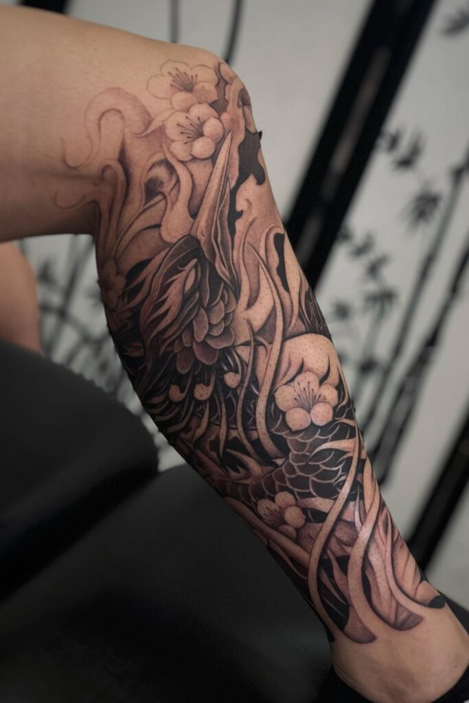 These tattoos often incorporate other traditional symbols such as koi fish, dragons, and waves, enhancing the overall narrative and cultural depth of the artwork.