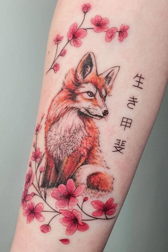 This tattoo combines the elegance of cherry blossoms with the mystique of a fox, creating a harmonious balance of nature and folklore.