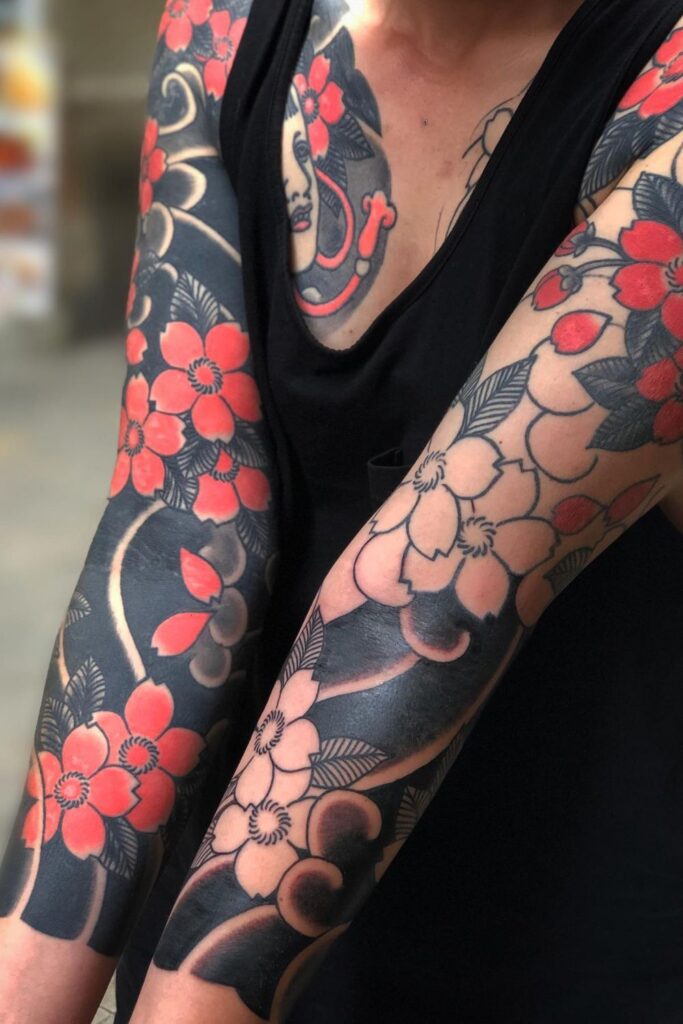 The contrasting colors enhance the traditional Japanese aesthetic, making this a striking choice for individuals seeking a full-arm design that reflects cultural heritage and bold artistic expression.